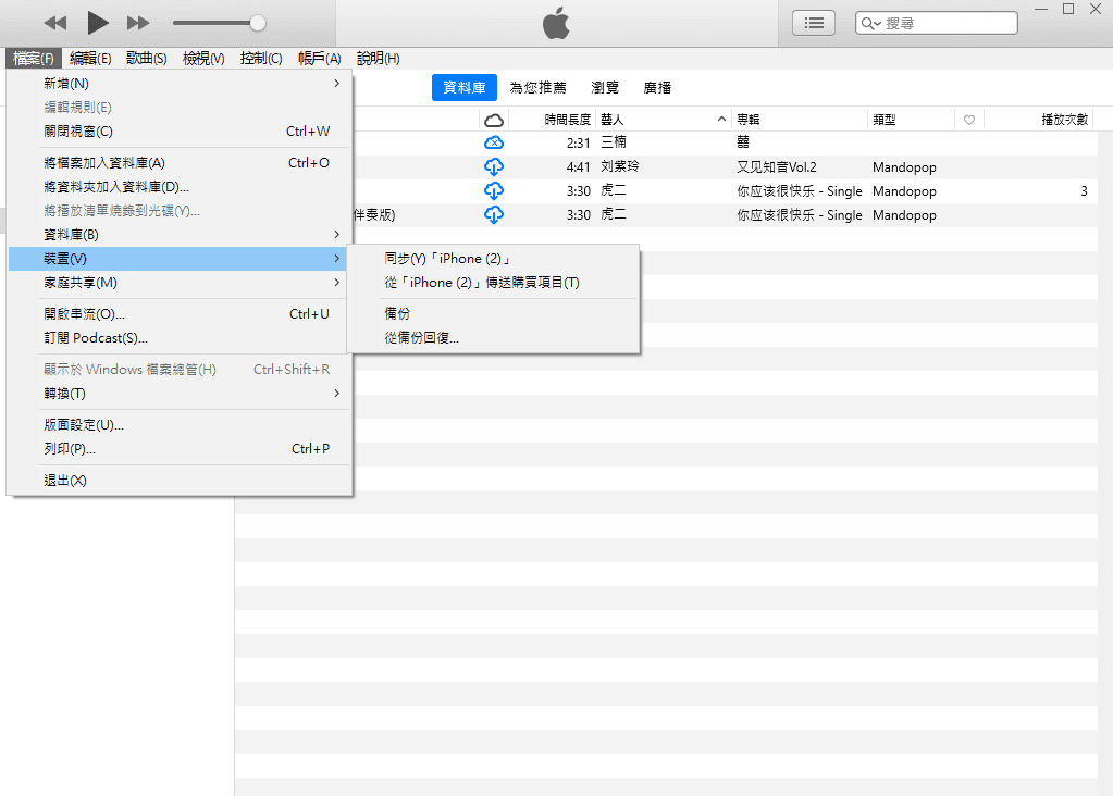 如果您在摘要頁面發現立即備份按鈕是灰色的,您可以在iTunes頂部查看是否呈現正在備份狀態。因爲在檔案 > 裝置 > 備份處同樣可以對iPhone進行備份。