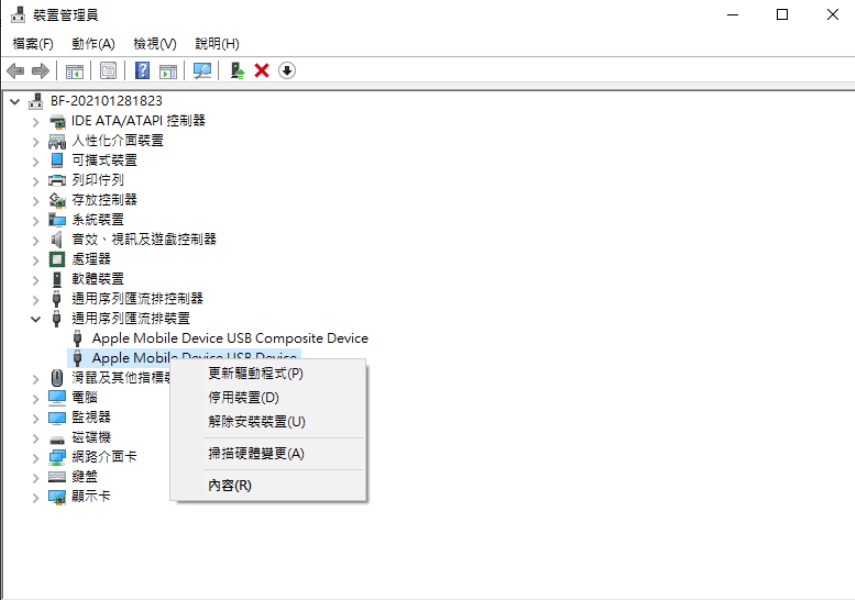 4. 右鍵點擊 Apple 行動裝置USB驅動程式,選取更新驅動程式。
