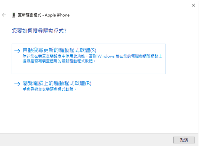 5. 選擇自動搜尋更新的驅動程式軟體,完成後,將 iPhone 連接到 iTunes 檢查是否顯示。
