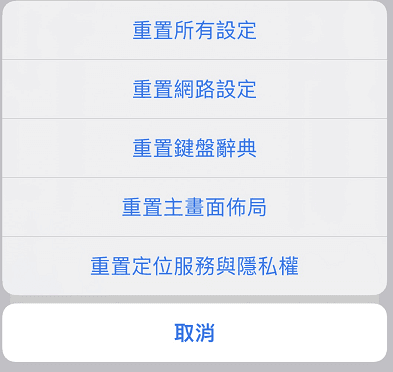 前往 iPhone 設定 > 一般 > 移轉或重置iPhone > 重置 > 選取重置定位於隱私權