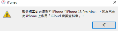 [iTunes]部分檔案尚未拷貝至iPhone,因為已在此iPhone上啟用iCloud音樂資料庫。
