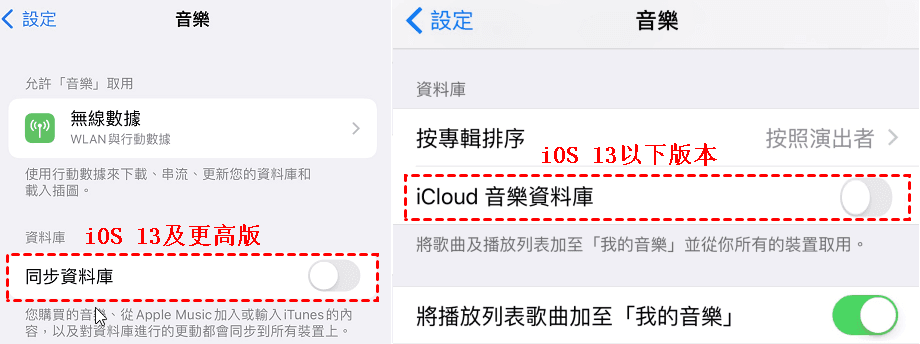 - 裝置為較舊版iOS,點擊關閉iCloud音樂資料庫。