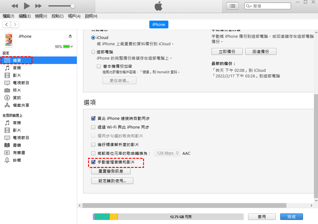 步驟2. 在摘要頁面找到並勾選手動管理音樂和影片。