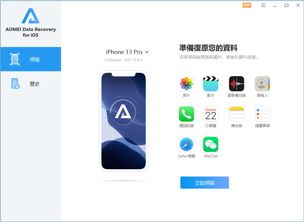 2. 運行AOMEI數據回復工具,在掃描選項處點擊立即掃描。