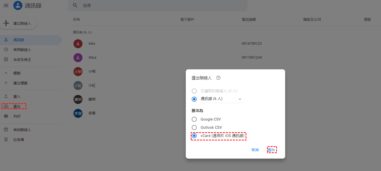 在電腦上登入Google Contacts > 在左側菜單欄中點擊匯出 > 檢查匯出訊息和格式(vCard適用於iOS通訊錄) > 點擊匯出。