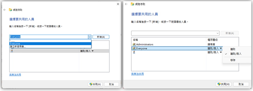 3. 將Everyone的權限設定為讀取/寫入,點擊共用。