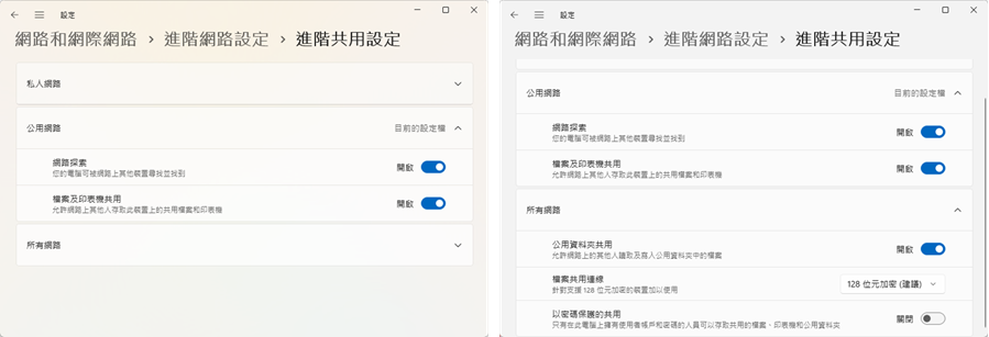 5. 在所有網路中開啟共用資料夾共用並關閉以密碼保護的共用。