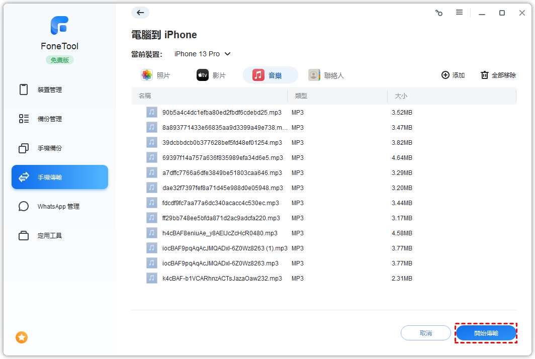 - 自定義傳輸:FoneTool提供靈活的音樂選取功能,保證您自由傳送喜歡的音樂。