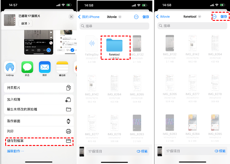 6. 前往iPhone照片App > 轉到相簿選項 > 打開您要傳輸到電腦的相簿 > 全選裡面的照片 > 點擊分享按鈕 > 點擊儲存到檔案 > 在iMovie選中您建立的FoneTool資料夾 > 點擊儲存將相簿中的照片傳輸到這裡。