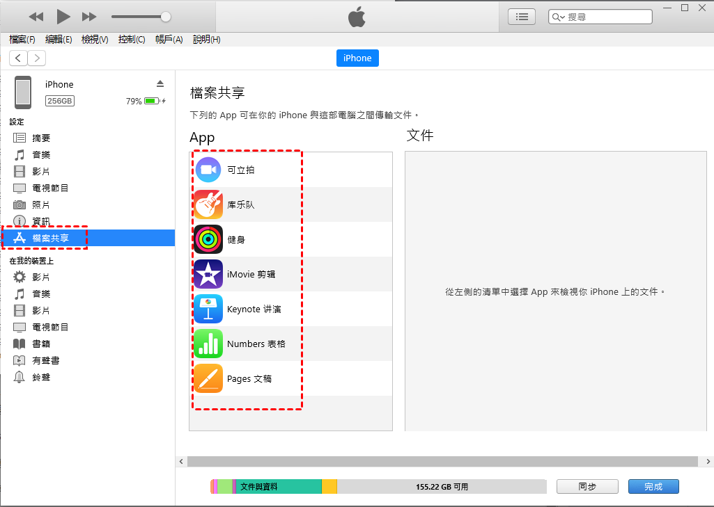 3. 在檔案共享選項處檢視iTunes能與哪些檔案App進行檔案共享。