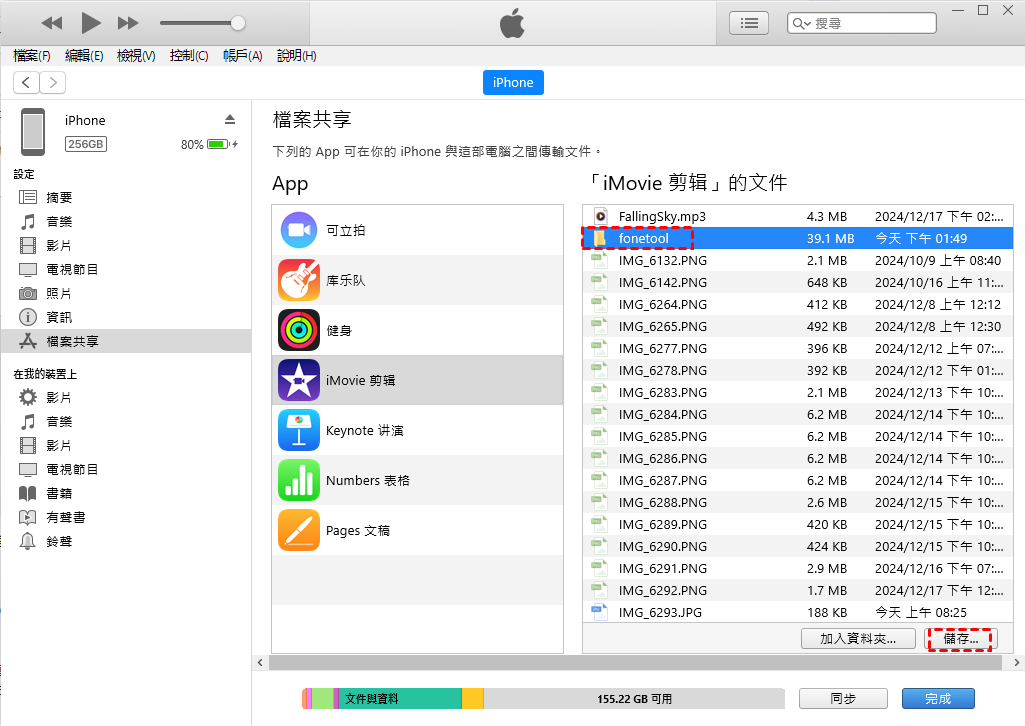 7. 完成後,再前往iTunes的檔案共享點擊iMovie > 選中FoneTool > 點擊儲存以將iPhone相簿傳到電腦。