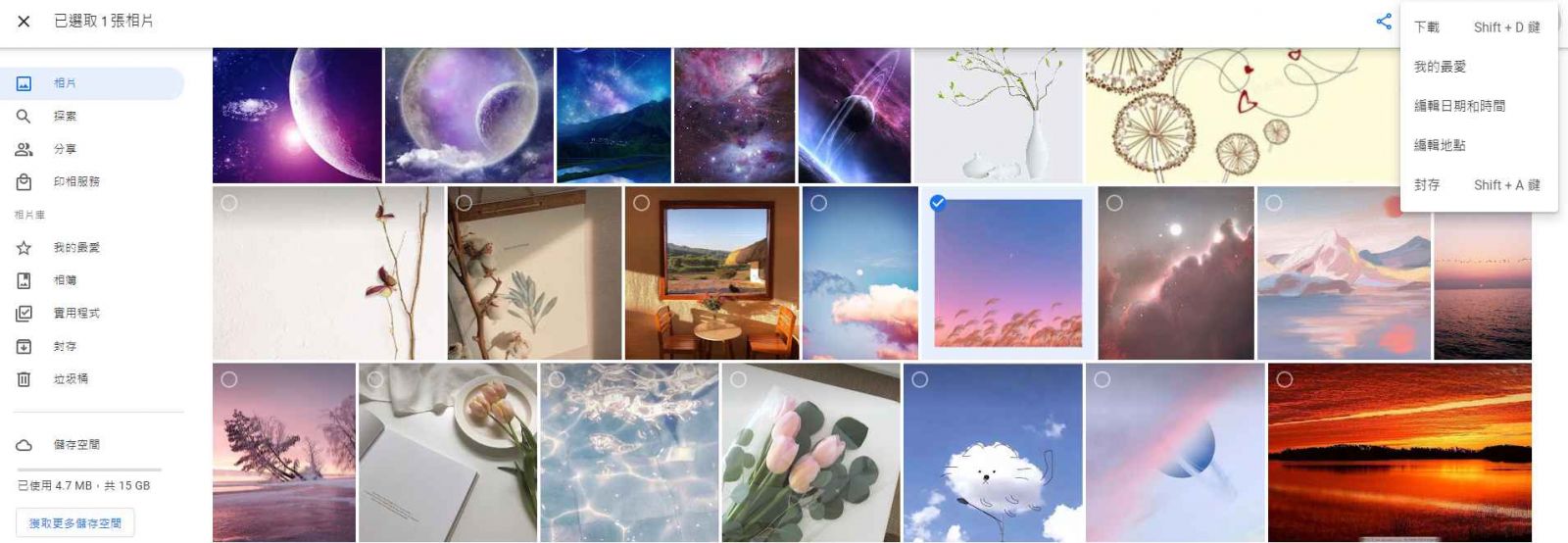從Google Photos下載照片:在電腦上打開瀏覽器登入photos.google.com > 選取需要的照片 > 點擊右上角的按鈕並點擊下載,將照片保存到電腦。