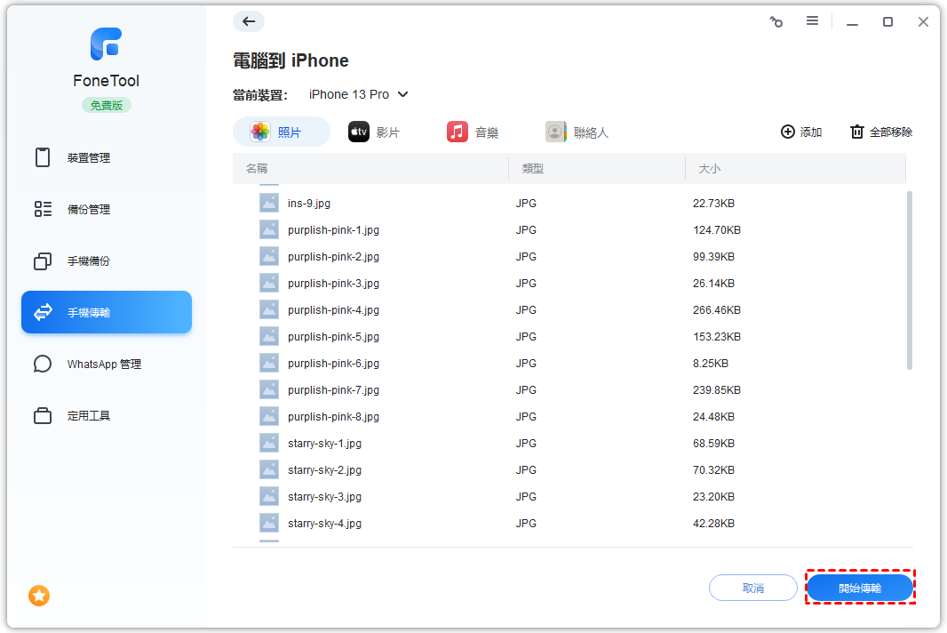 4. 確認要傳輸到 iPad 的照片 > 最後,點擊開始傳輸。