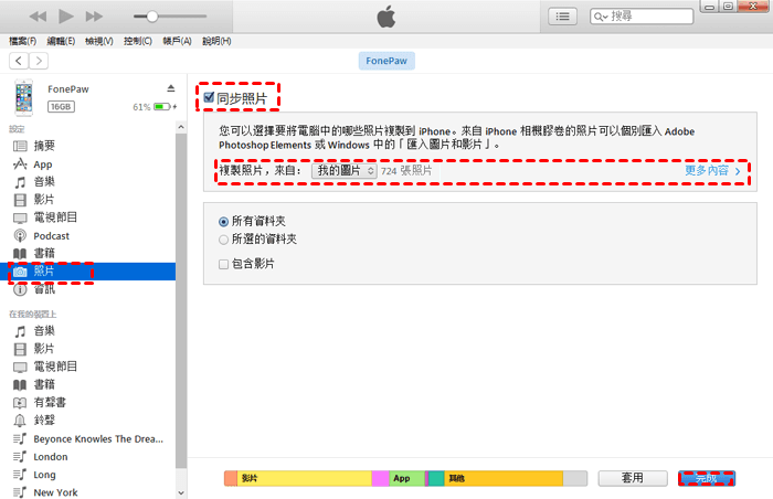 2. 在iTunes中點擊iPad裝置 > 照片 > 勾選同步照片 > 選取包含圖片的資料夾 > 點擊完成,這時它將開始將照片傳輸到iPad。