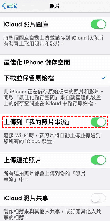 2. 在iPhone和iPad上打開照片串流:設定 > Apple ID > iCloud > 照片 > 打開上傳到我的照片串流。