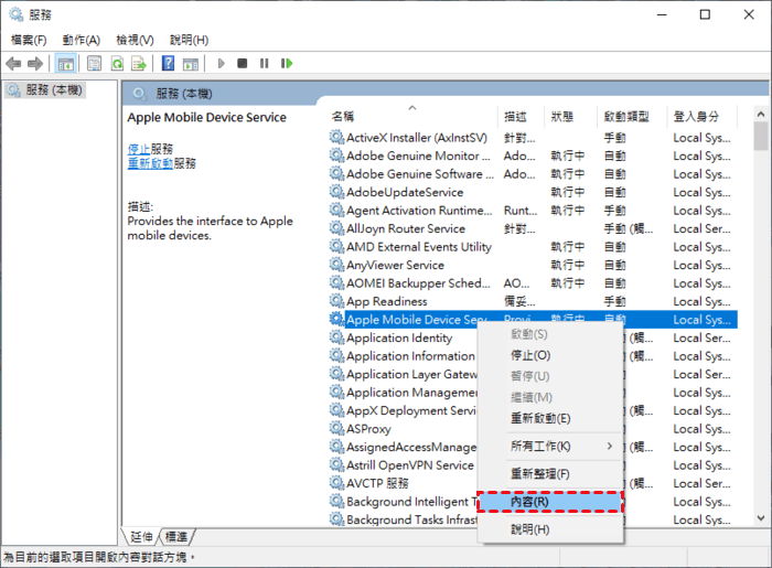 3. 在“服務”視窗找到“Apple Mobile Device Service”,右鍵選擇“內容”。