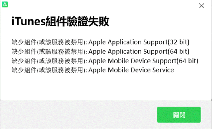 A:啟動MyRecover for iOS時,提示“iTunes元件驗證失敗”說明iTunes元件被解除安裝或相關服務被禁用。
