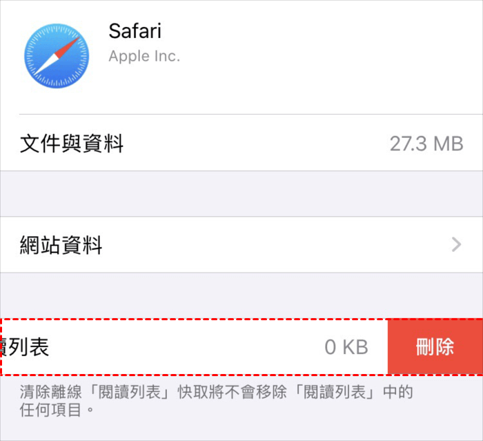 步驟3:您也可以嘗試另一個小妙招:將”離缐閲讀列表“往左滑,點一下“刪除”按鈕。如果您的iPhone這一部分有較大容量資料,可以嘗試這一招。