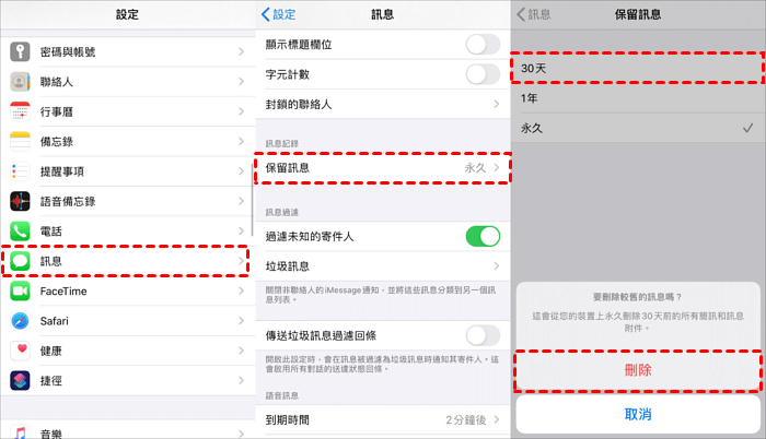 請前往“設定” > “訊息” > “訊息記錄” > 將“永久”改爲“30天” > “刪除”較舊的訊息。