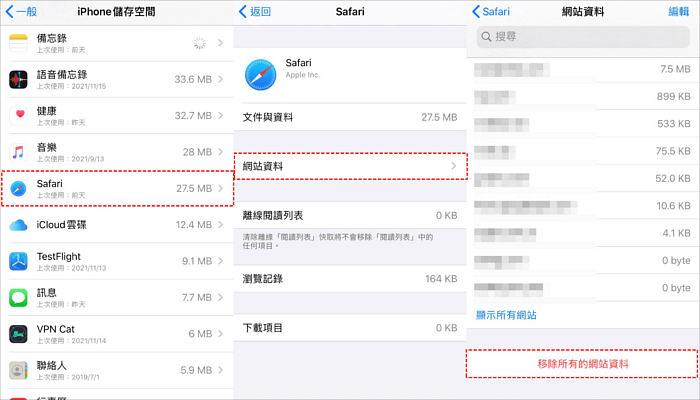 步驟2:找到“Safari” > “網站資料” > ”移除所有的網站資料”。