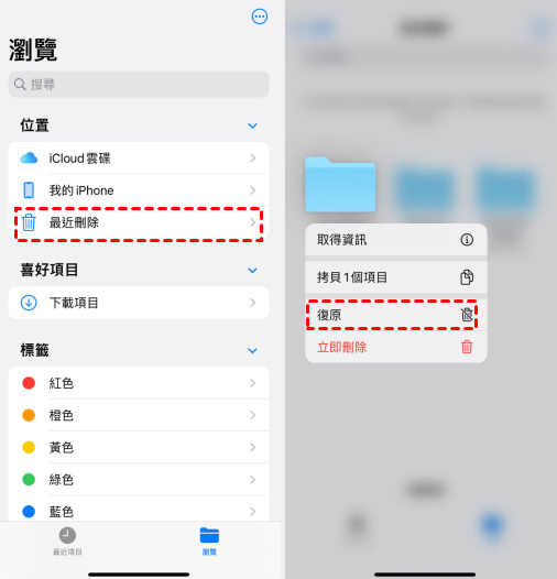 2. 在最近刪除資料夾找到需要回復的檔案並長按 > 點擊復原按鈕以回復iPhone被刪除的檔案。