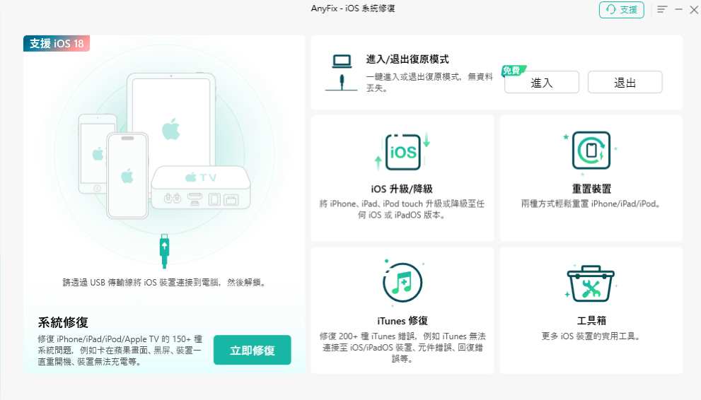 可修復 160 多個 iOS/iPadOS 問題,包括啟動循環、當機、更新失敗等,並確保無資料遺失。