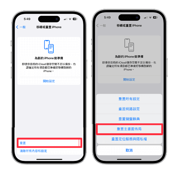 若要重設主畫面佈局,請前往 iPhone 設定應用程式 > 點選一般 > 傳輸或重置 iPhone > 重置 > 選擇重設主畫面佈局。最後,點選重置主畫面佈局進行確認。