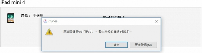 將 iPhone、iPad 連接到 iTunes 以開始回復或更新時,iTunes 提示「無法回復 iPad。發生未知的錯誤(4013)」。這是為什麼?如何修復,以讓 iPad、iPhone 能正常執行回復程式?