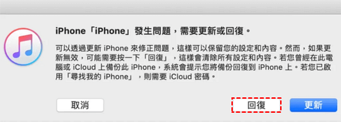 - 將iPhone置於復原模式將會清除您iPhone上的所有資料,請確認您有可回復的備份。