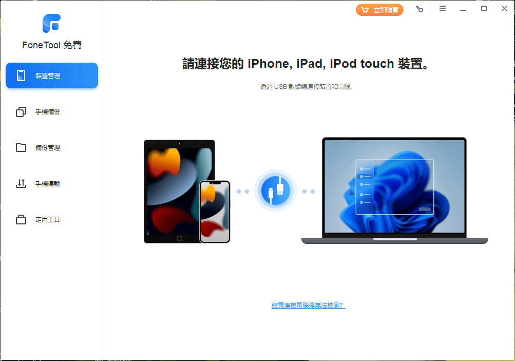 步驟1. 在電腦上下載FoneTool,將有觸控問題的iPhone連接到電腦。
