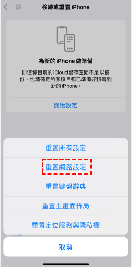重置網路設定:前往 iPhone「設定」> 點擊「一般」> 點擊「重置或移轉 iPhone」>「重置」> 點擊「重置網路設定」。
