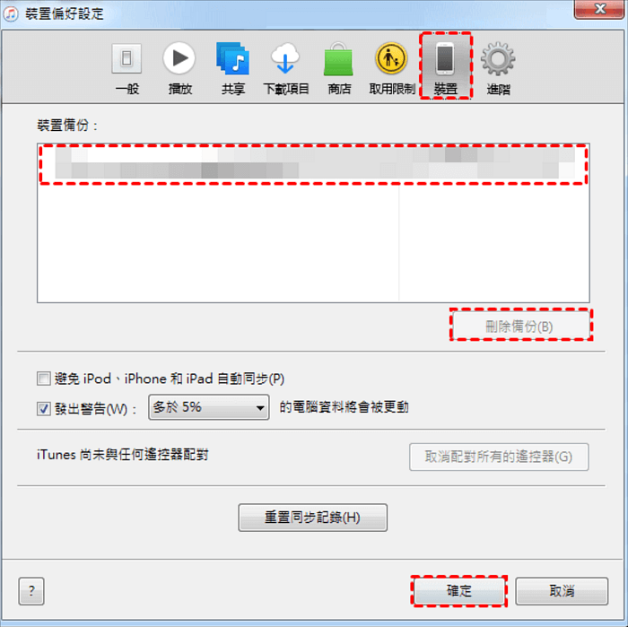 ◆ 確認您有其他途徑可回復備份後,您可以嘗試將iTunes備份刪除,再重新備份一次,看看是否能從新的備份回復iPhone。