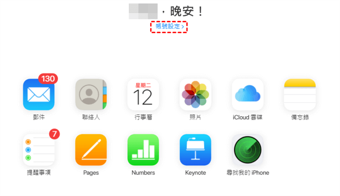 步驟1:登入iCloud.com,點一下“帳號設定”。