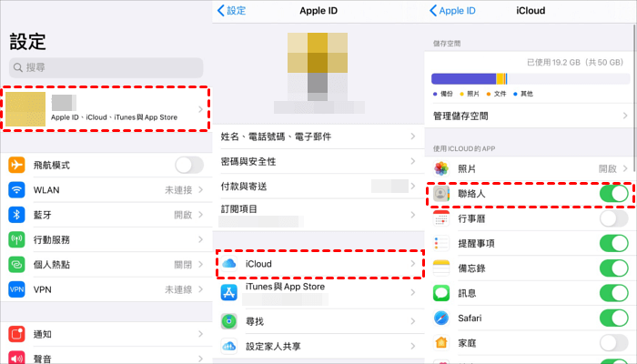 確認您已在“使用ICLOUD的APP”中啓用“聯絡人”後,請根據以下教學救回iPhone通訊錄。