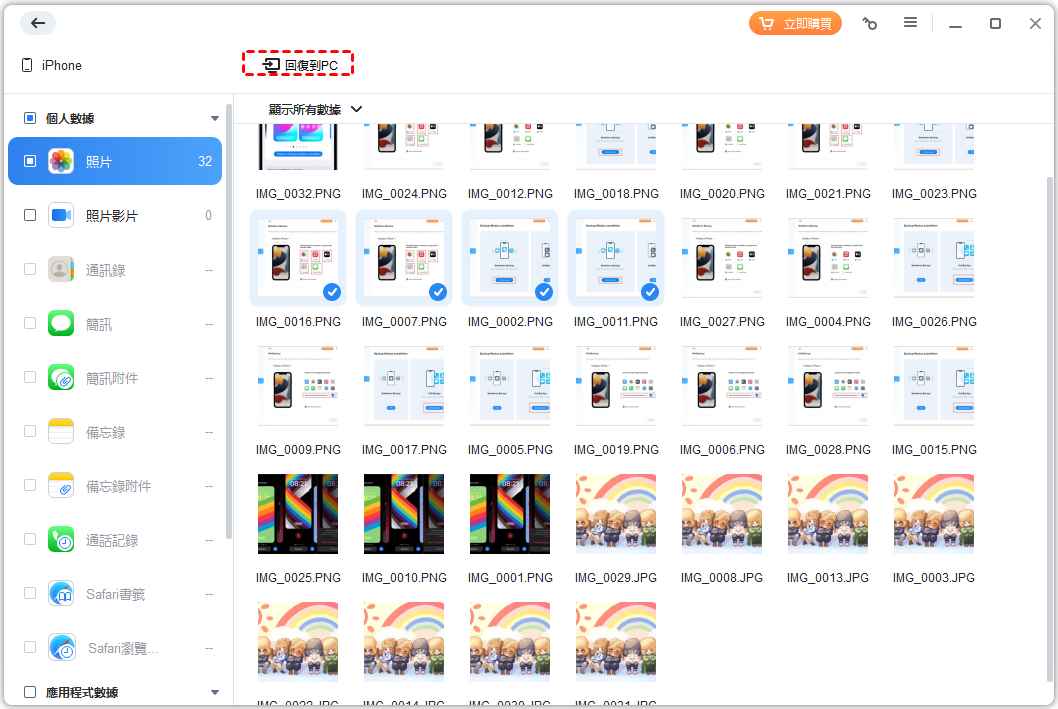 步驟3. 我們以還原已刪除的照片為例,點擊照片>預覽並選擇要還原的已刪除照片>然後點擊回復到PC開始。