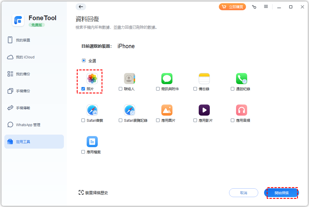 步驟2. 檢查您需要還原的檔案圖示 > 點擊開始掃描以掃描 iPhone 上的資訊。