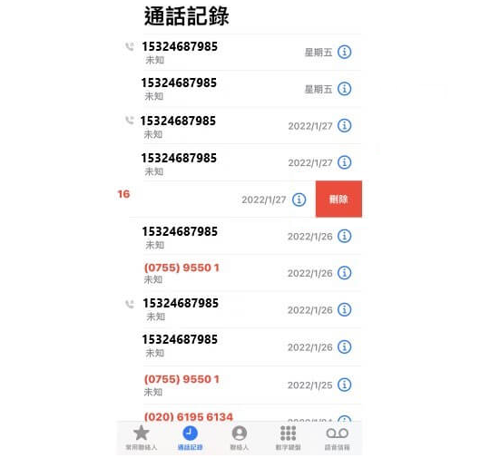 2. 若要清除單一呼叫,您可以找到該呼叫並向左滑動以顯示刪除按鈕。只需點擊刪除即可刪除此通話。