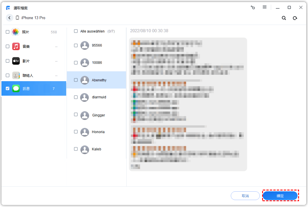 2. 點一下訊息選項 > 選取需要備份到電腦的訊息,點一下確定。