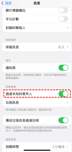 2. 向下滑動,在訊息過濾選項下打開過濾未知的寄件人按鈕。