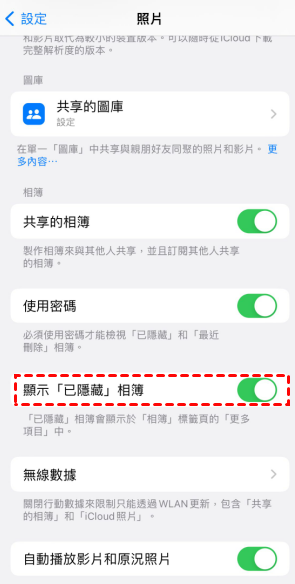 2. 再次向下滑動找到顯示「已隱藏 」相簿 > 然後點一下按鈕以打開它。