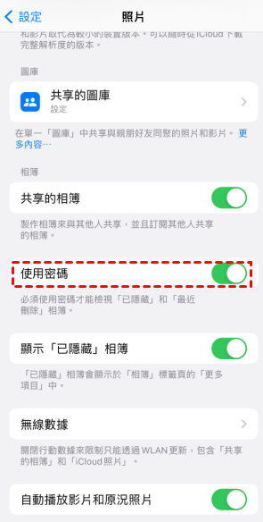 已隱藏項目中不僅有被隱藏的照片,其實隱藏的相簿也在這裡面。為了保證被隱藏照片的安全,您可以使用面容ID、觸控ID或密碼來鎖定它們。當您想訪問它們的時候,輸入密碼即可暢通無阻的查看。