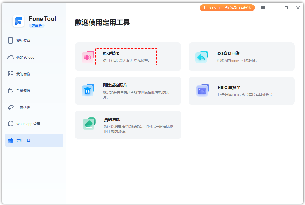 步驟1. 透過 USB 將 iPhone 連接到電腦 > 啟動 FoneTool,點擊定用工具> 選擇鈴聲製作選項。