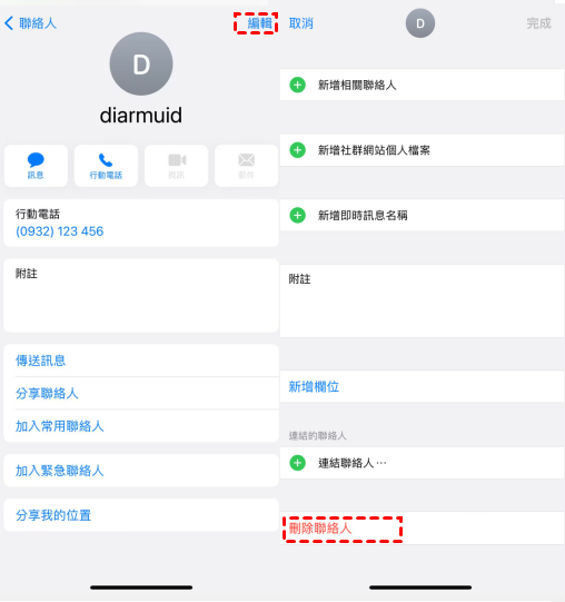 前往您的iPhone通訊錄應用程式 > 點擊聯絡人 > 編輯 > 向下捲動到螢幕底部,點擊刪除聯絡人 > 再次點擊刪除聯絡人進行確認。