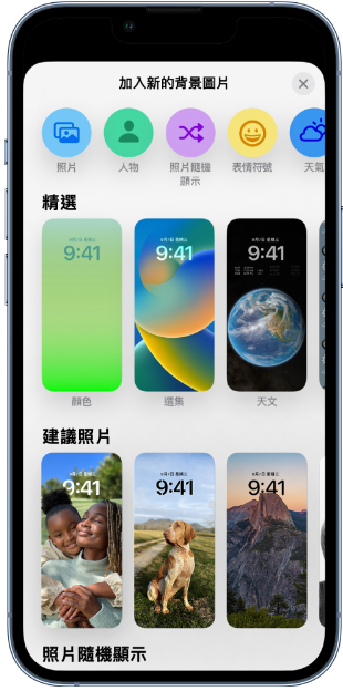 3. 然後從加入新的背景圖片中選取一個新壁紙,包括人物、照片、照片隨機播放、表情符號、天氣、天文、收藏夾和顏色。