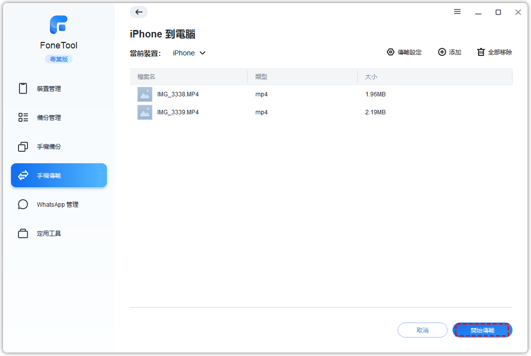 - 快速傳輸速度:FoneTool確保快速傳輸速度,讓您能夠立即將影片移至PC。