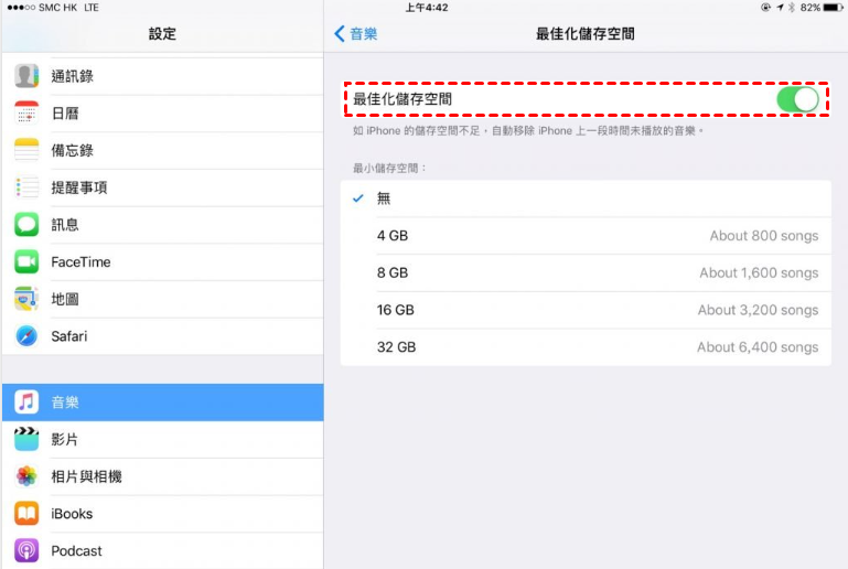 您還可以在iPad上刪除一些已經不想再欣賞的歌曲來釋放空間,或者前往設定 > 音樂 > 找到並點擊最佳化儲存空間,然後打開其按鈕。