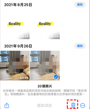 除了能讓iPhone合併重複項目外,您還可以選擇使用幾乎相同的步驟刪除所需的重複項目。只需要從重複相簿中選取需要刪除的重複照片,然後按下螢幕底下的垃圾桶圖示即可刪除選定的重複照片。