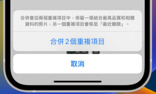 “合併將標題、關鍵字和收藏夾等相關數據合併到一張最高品質的照片中,包含合併重複項的相簿將使用合併的照片進行更新。”