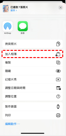 4. 點擊加入相簿 > 點擊新增相簿或選取已有的相簿進行儲存。