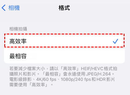 您可以透過轉到iPhone 上的設定 > 相機 > 點一下格式 > 選擇高效率來啟用它。